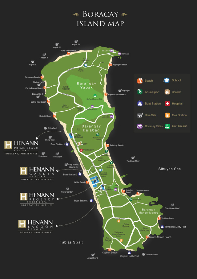 Boracay is a small island in the Philippines located approximately 315 km (196 mi) south of Manila and 2 km off the northwest tip of Panay Island in the Western Visayas region of the Philippines. Boracay Island and its beaches have received awards from numerous travel publications and agencies. The island comprises the barangays of Manoc-Manoc, Balabag, and Yapak municipality of Malay, province of Aklan. The island is administered by the Philippine Tourism Authority and the provincial government of Aklan. Apart from its white sand beaches, Boracay is also famous for being one of the world's top destination for relaxation. It is also emerging among the top destinations for tranquility and nightlife.