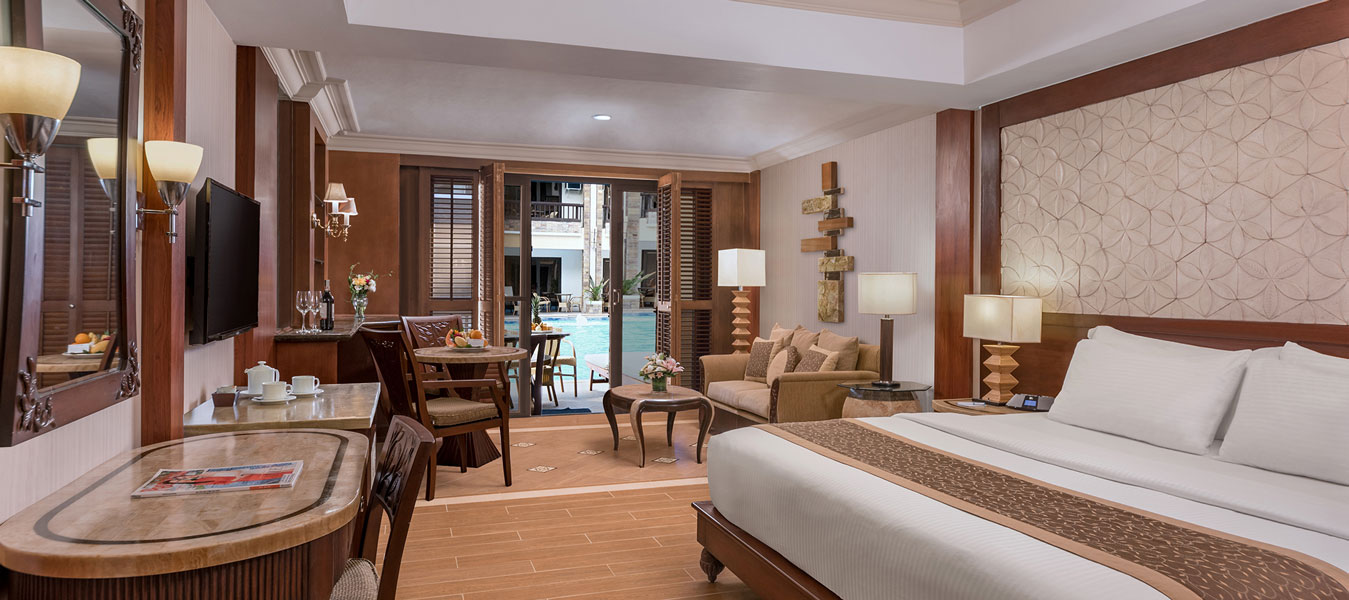 Experience luxurious suite with a veranda that opens directly to the swimming pool. With a receiving area, to add that little touch of comfort, this suite is designed to create the perfect indulgence and style while enjoying your vacation or stay. A sleek granite bathroom includes a separate tub and shower. Each Suite offers a sumptuously styled, colourful living area featuring tropical décor and a plush sofa. Experience all the luxury you could want from Henann Regency’s first rate Suite.