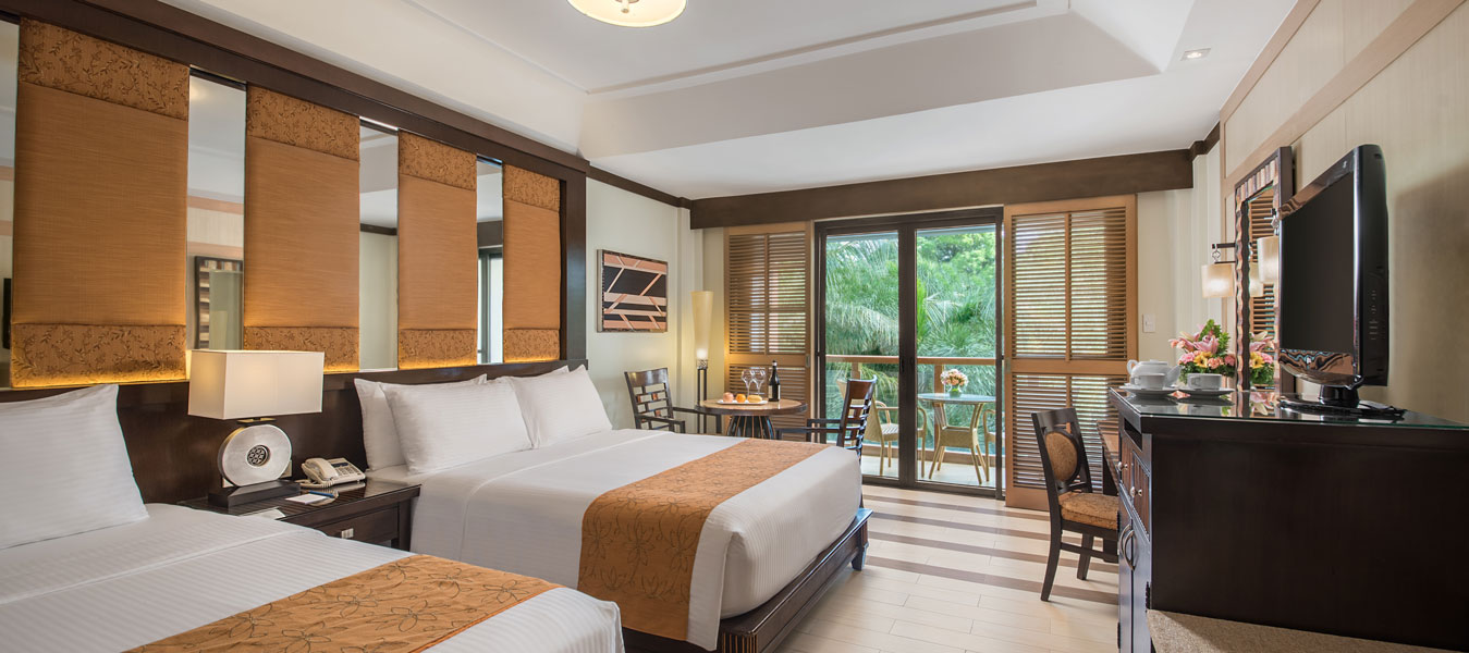 A Premier Room offers the comfort of a 440-square-feet floor space featuring choices of Asian-inspired and modernly-styled interiors. Each Premier Room offers its own balcony with outdoor furniture for two and a great view of the Resort’s impressive pools and stylish outdoor landscape. This room type offers a marble-clad bathroom featuring a bathtub and a spacious lavatory area. Premier Rooms are available in one (1) king-size bed or one (1) queen-size with one (1) single bed configurations.
